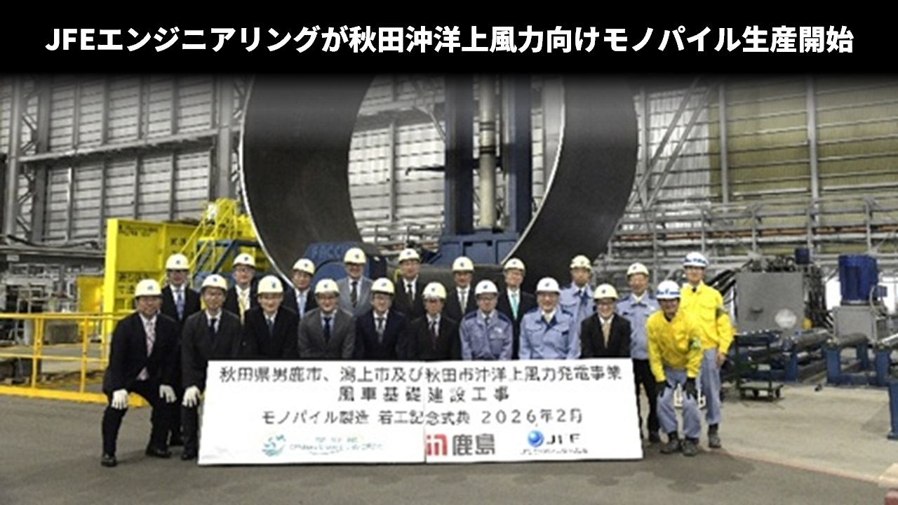 2026年3月2日、JFEエンジニアリングは「秋田県男鹿市、潟上市及び秋田市沖における洋上風力発電事業」向けのモノパイルの生産を開始することを発表しました。生産開始式典は岡山県笠岡市の笠岡モノパイル製作所で2月27日に行われ、鹿島建設などの事業関係者が出席しました。JFEエンジニアリングは、2025年12月に鹿島建設から21基のモノパイル及びトランジションピースの製造・輸送を受注。モノパイルは最大約80m、直径10.5m、重量約2,000トン、トランジションピースは約26m、直径9.6m、重量約500トンで、各21基生産されます。このプロジェクトは国産モノパイルを初めて採用するもので、Vestas製の15MW風力タービンを21基設置し、総発電出力は315MWの予定で、2028年6月30日に運転開始を目指しています。鹿島建設は2025年10月に男鹿・潟上・秋田 Offshore Green Energy合同会社と契約を結び、関連企業としてJERA、bp Japan、電源開発、東北電力、伊藤忠商事が参加しています。