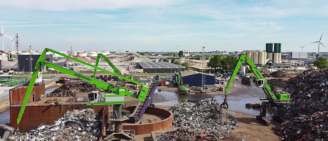 EMRは、イギリス、アメリカ、ドイツ、オランダに約150のリサイクル施設を持ち、消費者製品や廃車、産業や建設、解体から出る材料を価値ある資源に変えることで、循環経済を実現するために業界、政府機関、一般市民と国際的に協力しています。アムステルダムでは、効率的なシアや先進的な水処理施設、包括的な火災防止システムなど、現代的な設備や環境技術に投資しています。毎年、アムステルダムで約100万トンの金属を処理し、廃棄材料の再利用を通じて気候中立企業を目指しています。この目標を達成するために、アムステルダムの施設では環境に優しいSENNEBOGENのマテリアルハンドラーを使用しています。EMRはオランダ、ベルギー、ドイツからの古い鋼材を処理し、二次資源は完全電動トラックで地元のTata Steelに運ばれ、国際的な製鋼業者に出荷されます。リサイクルは、環境に有害な鉄鉱石の採掘と処理を代替し、EMRがリサイクルした金属は毎年約1570万トンのCO2を削減しており、これはローマのような大都市の年平均CO2排出量に相当します。