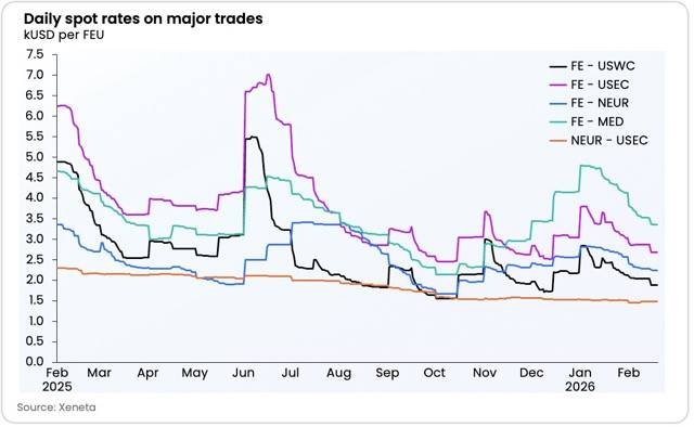 今週、極東からの主要なフロントホール貿易において平均スポットレートが下落しています。Xenetaのチーフアナリスト、Peter Sandは「極東から米国西海岸および東海岸への輸送では、スポットレートの低下と供給能力の若干の増加が見られ、典型的な市場の発展を示しています」と述べています。一方、極東から北欧への輸送では、供給能力が週ごとに減少する中、スポットレートは引き続き下落しており、より弱い市場を示唆しています。2026年はコンテナ輸送における過剰供給が特徴となる見込みであり、紅海へのサービスの大規模な復帰が影響を与える可能性があります。米国とイランの間の緊張がこの状況に影響を及ぼす可能性があり、特にフーシ派が紅海での商船攻撃を再開する脅威がある場合に懸念されます。米国とイランの間での全面的な衝突が起こらなくても、政治指導者の軍事的姿勢や発言が地域の安全状況に影響を与える可能性があり、キャリアが紅海の航行再開計画を遅らせるかもしれません。これが実現すれば、2026年の深い時期における過剰供給の問題を緩和することになるでしょう。
