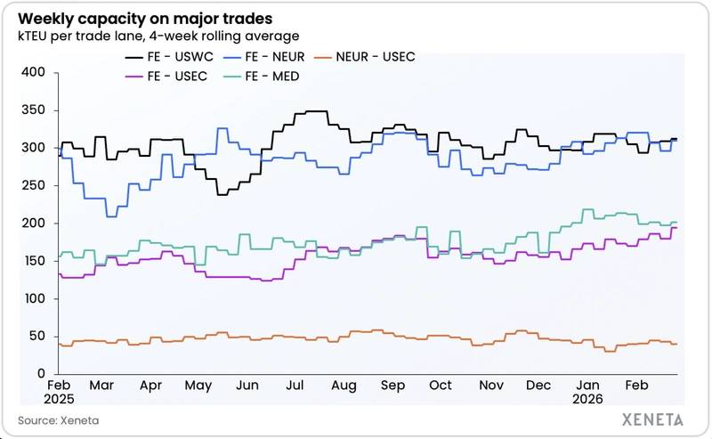 Xenetaのチーフアナリスト、Peter Sand氏は、米国最高裁の最近の関税判決が海上コンテナ輸送に影響を与えるが、大きな前倒し需要の増加を引き起こすことはないだろうと述べています。関税が一部の中国製品に対して低下したものの、判決とその政治的影響は多くの船会社に不確実性をもたらしています。来週ロングビーチで開催されるTPM業界会議では、長期貨物契約が交渉されますが、この不確実性により、米国の船会社は新たな契約の締結を遅らせる可能性があります。同時に、主要なフロンホール貿易における運賃とキャパシティの動向も長期契約交渉に影響を与えると指摘しています。今週と来週は、東アジアから米国およびヨーロッパへのフロンホール貿易でブランクセーリングが大幅に増加し、運賃が安定しています。米国最高裁の関税判決が影響を与えることで、3月初めに平均スポット運賃が上昇する可能性があり、2026年の下落傾向を逆転させる要因となるかもしれません。貨物の急増はないものの、市場のセンチメントに影響を与える可能性があります。そして、大規模なブランクセーリングと相まって、運賃に上昇圧力がかかり、運送業者にとってのプラス要因となると述べています。