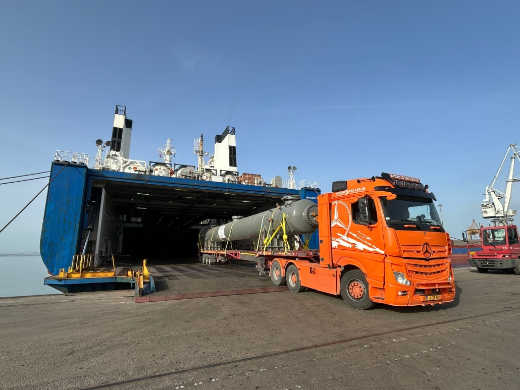ギリシャのプロジェクト物流専門会社Cosmatos Groupは、EKME(石油・ガス施設製造業者)を代表して、東地中海への重要な精製装置の多モーダル配送を成功裏に実施しました。Cosmatosは、製造元からテッサロニキ港までの過大なコンポーネントの物流を管理しました。主な荷物は23.5メートルの抽出装置で、初期の陸上輸送には特別なトレーラーが使用されました。テッサロニキ港では、物流チームが自由区域入境手続きを行った後、RoRo(ロールオン/ロールオフ)技術を用いて荷物を船に積み込みました。Cosmatos Groupは、地中海を安全に横断するための貨物の固定にも責任を持ち、空の特別トレーラーを東地中海先から戻すことも含め、エネルギーセクター向けのトータル輸送ソリューションを提供しました。