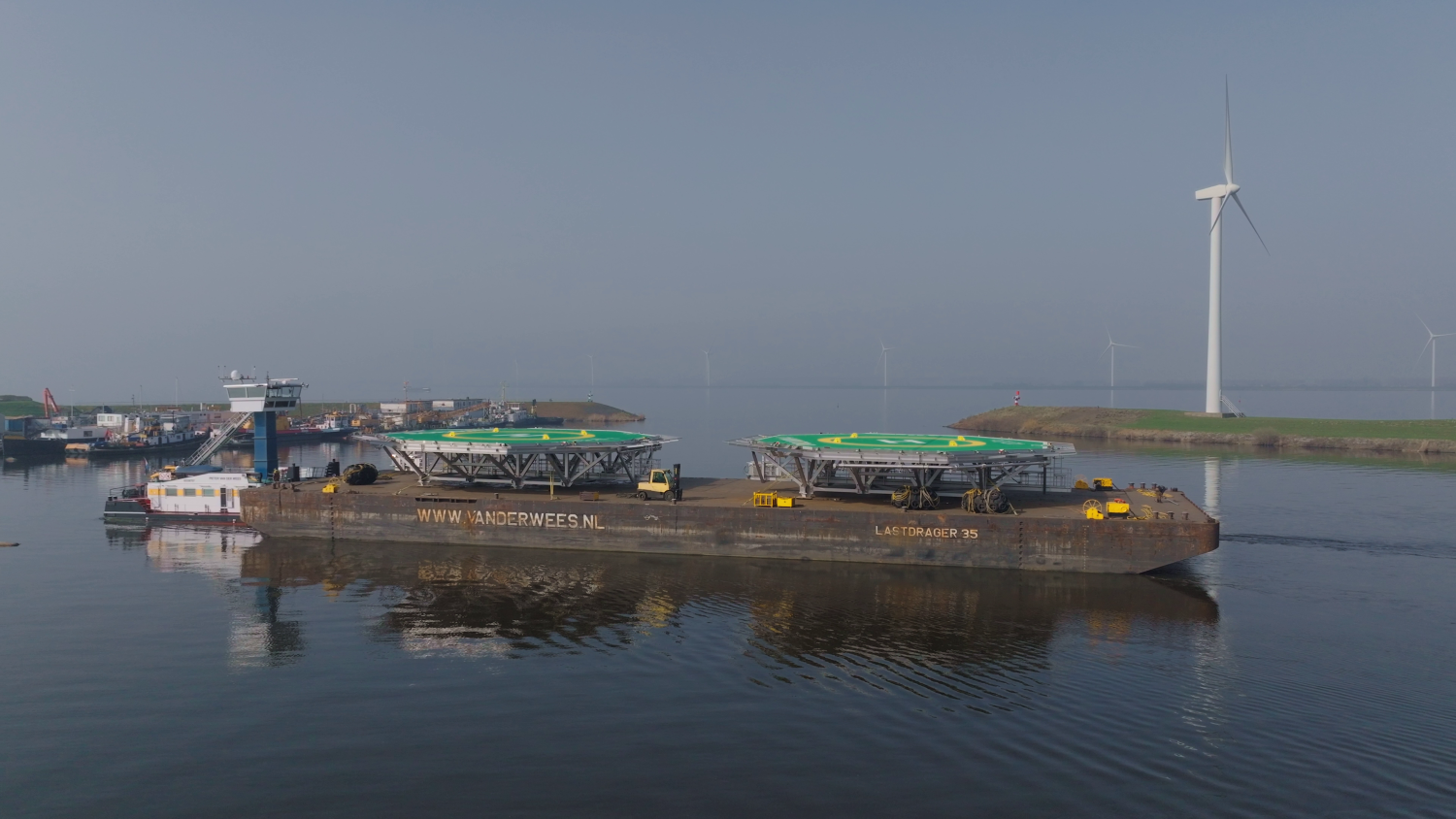 Koninklijke Van der Wees Transportenが、洋上風力発電所用のヘリデッキをポンツーンから船へ移動させました。