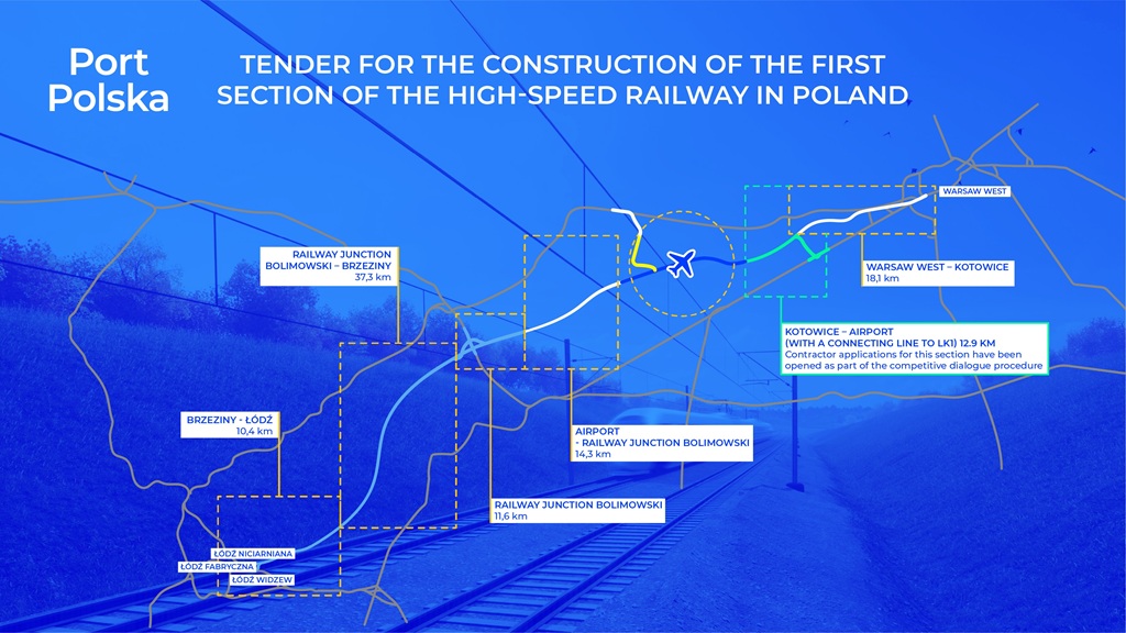 コトヴィツェから空港までの区間は、ワルシャワ、ロッズ、ポズナン、ブロツワフを結ぶ「Y」型高速鉄道の一部であり、最高350 km/hの速度に対応した新しい技術基準を備えています。CPKは、ワルシャワ-ロッズルートの他の5つの区間の入札も計画しており、新しい高速鉄道路線の総延長は約120 kmに達します。必要なすべての位置決定申請が提出されており、最初の承認は昨年11月にワルシャワ西近くの区間に対して与えられました。