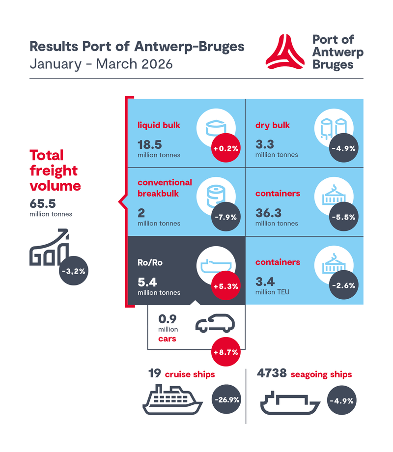 2026年第一四半期に、Port of Antwerp‑Brugesは65.5百万トンの海上貨物を取り扱い、昨年同期比で3.2%の減少となった。1月と2月は弱いスタートだったが、3月には回復した。一般貨物は特にコンテナと従来型一般貨物が圧力を受け、4.4%減少した一方、バルク貨物は安定しており0.6%の減少にとどまった。RoRoトラフィックは増加した。港の発表によると、結果は天候不良、社会的活動、地政学的緊張、欧州の産業基盤の弱体化などの複合的な要因を反映している。第一四半期の総貨物取扱量は2%減少し、特に天候の影響やストライキ、輸出の低迷がコンテナ交通に影響を与えた。また、中東の紛争の影響も初めて見られた。コンテナ交通は昨年同期比でトン数で5.5%、TEUで2.6%減少した。これは2025年の比較的強いスタートとの対比であり、容器アライアンスの再編成による高い流入量と西ヨーロッパの輸出ポジションの弱体化が背景にある。年初には極端な天候条件も影響し、1月には雪嵐と長期の寒波、さらに2月中旬までのビスケー湾での激しい嵐が航行やターミナル業務を妨げた。また、年金改革に対する4日間のストライキも大きな影響を与え、航行チェーンの中断により複数の船が他の港に回航され、計画された呼び寄せサイズは余剰ターミナル容量の不足により部分的にしか処理できなかった。